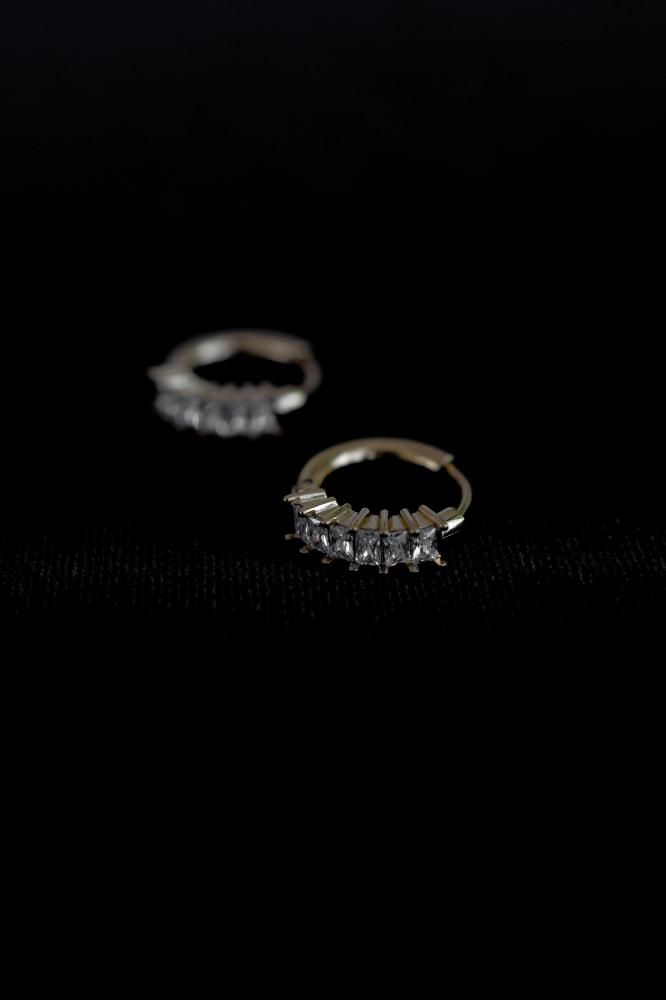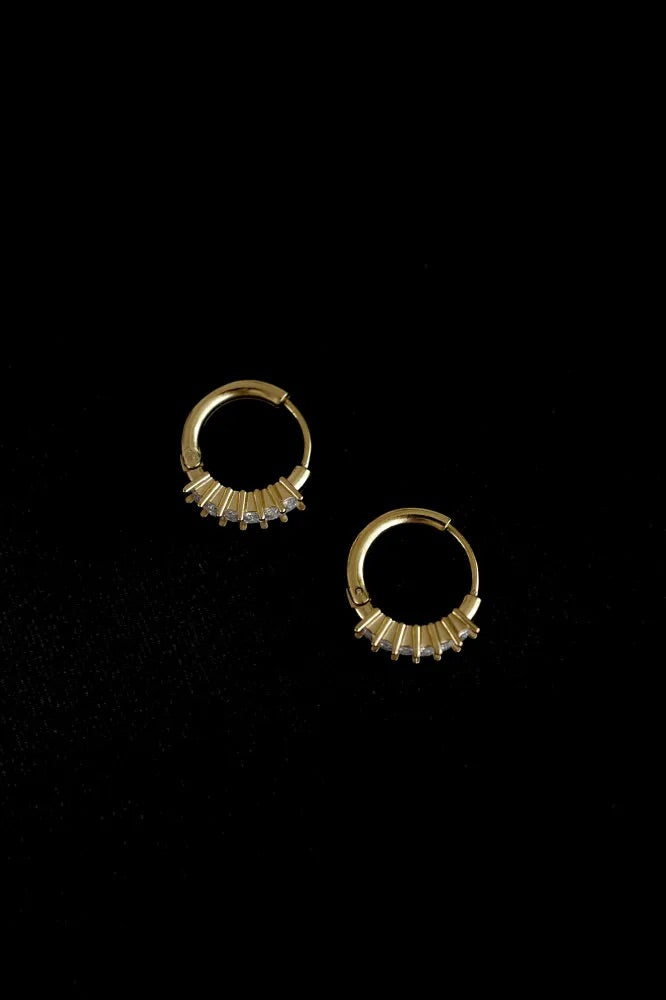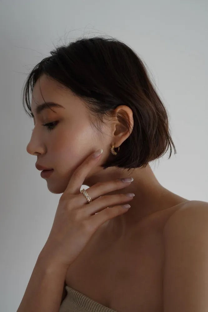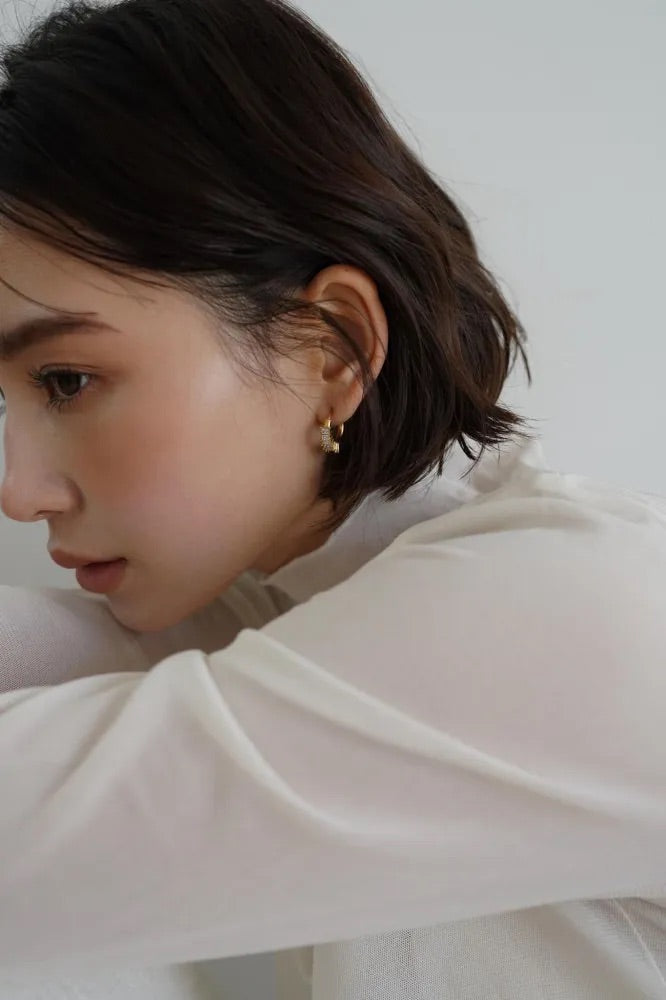 輝くストーンがあしらわれたディテールが、耳元を華やかに演出するフープ型ピアス。