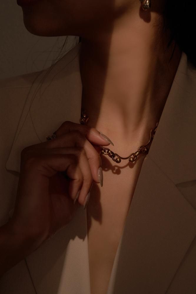 落ち着いたゴールドの輝きは滑らかな曲線を作るチェーンとマッチし上品なデザインに。