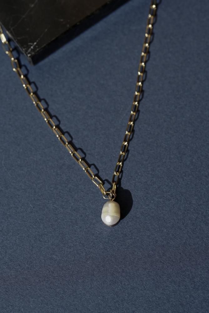 トップのナチュラルな淡水パールがポイントのロングネックレス。
