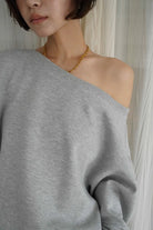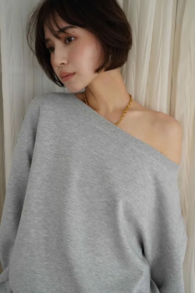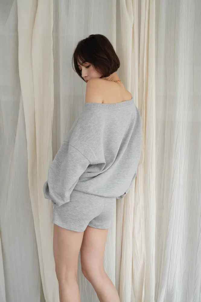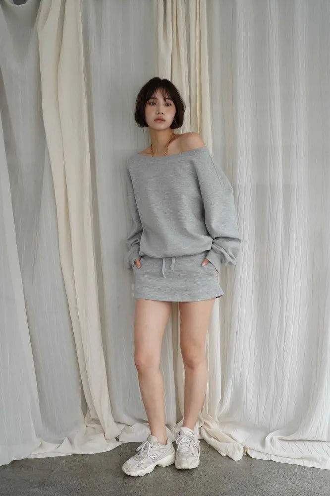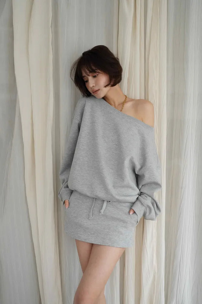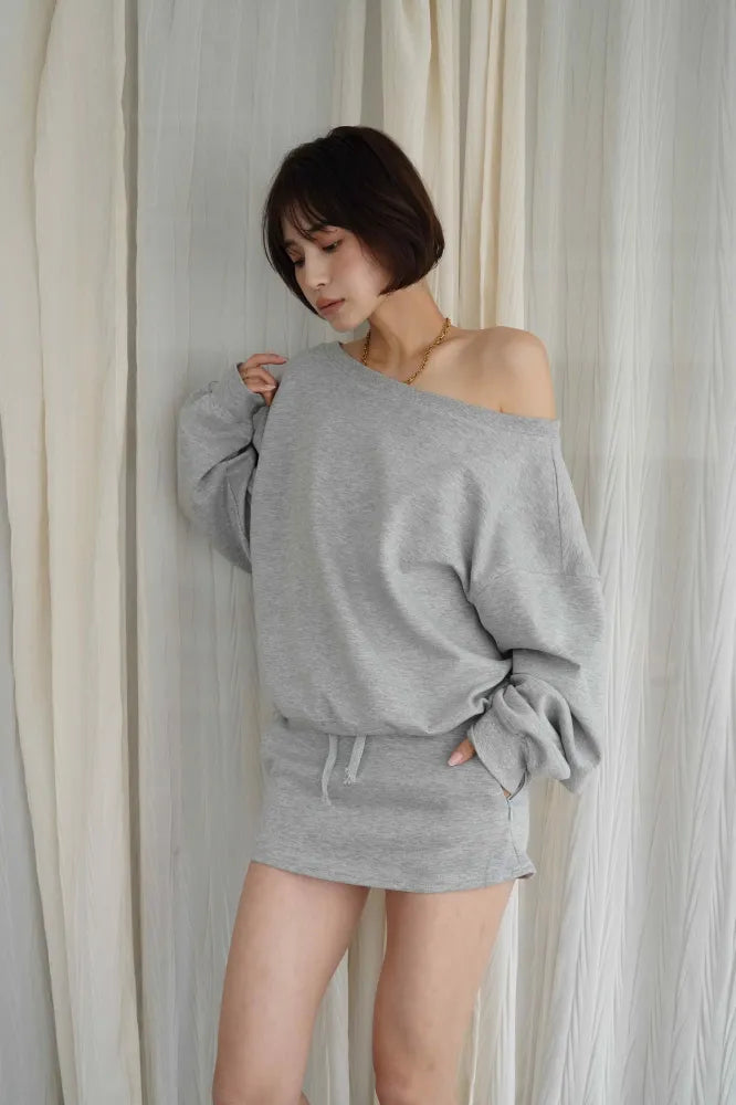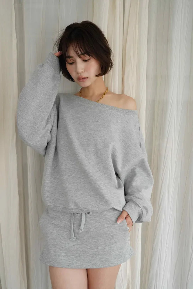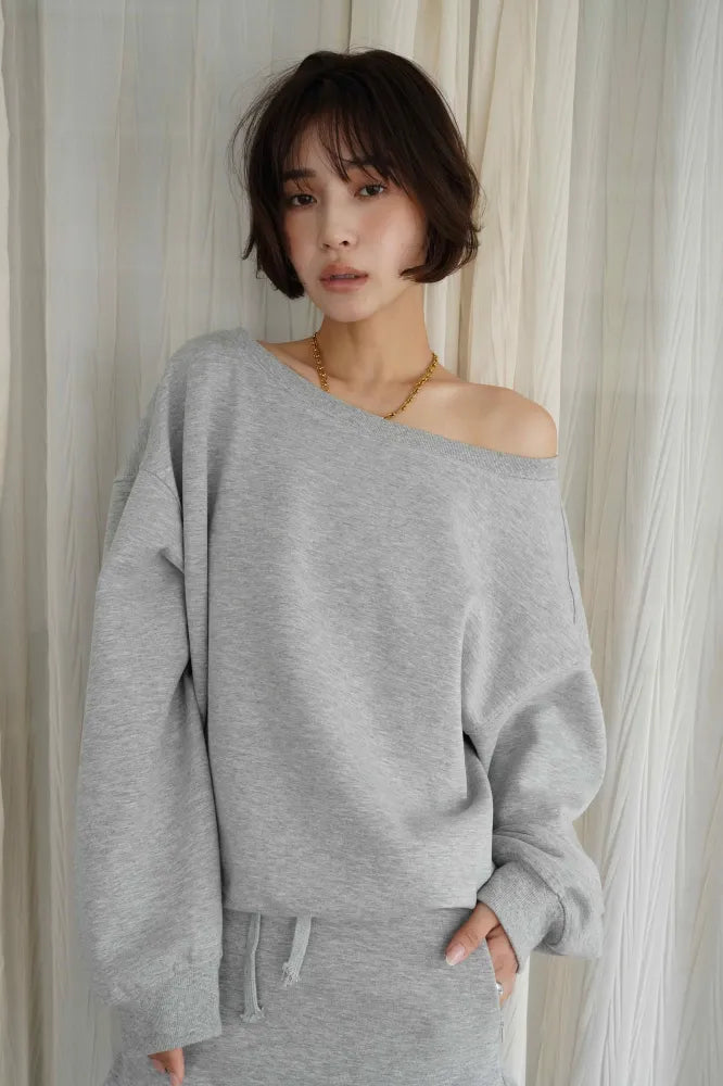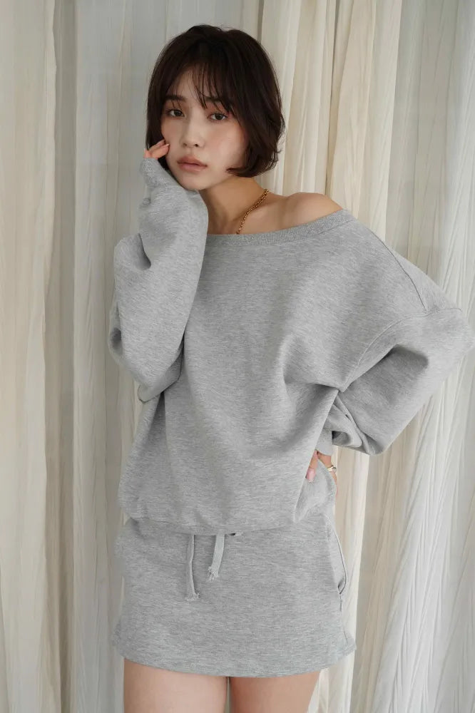 リラックス感と女性らしさを両立した、オフショルダーデザインのスウェットセットアップ。