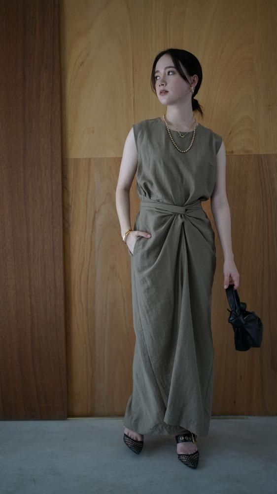 サッシュベルトを前面でクロスさせてドレープ感のあるデザインで大人カジュアルを演出。