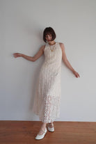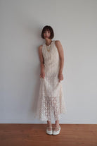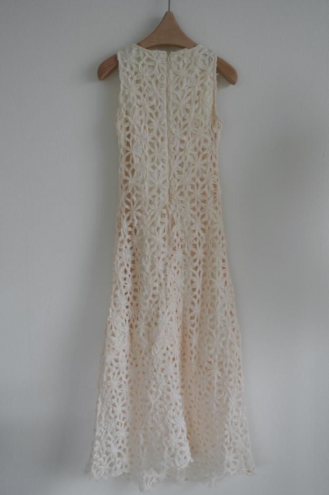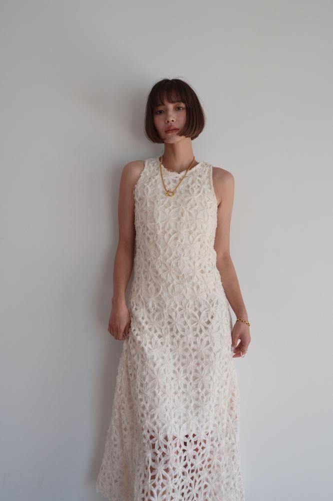 花を散りばめたかのような華やかさに、ノースリーブのスタイルとフィット感のあるシルエットが女性らしいフォルムを美しく引き立てます。