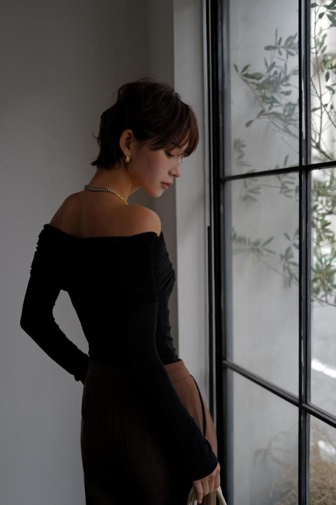 たっぷりと寄せたシャーリングディテールと、滑らかに流れるようなドレープが印象的で、シンプルながらも洗練された1枚に仕上がっています。